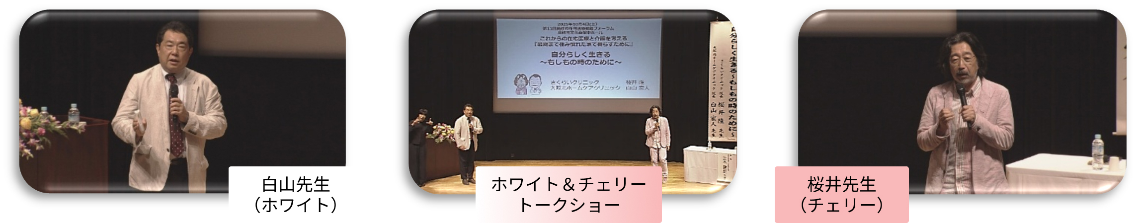 「自分らしく生きる~もしもの時のために~」というテーマで、桜井先生と白山先生(チェリー&ホワイト)のシン・ピンコロ4の寸劇映像の視聴とご講演がありました。